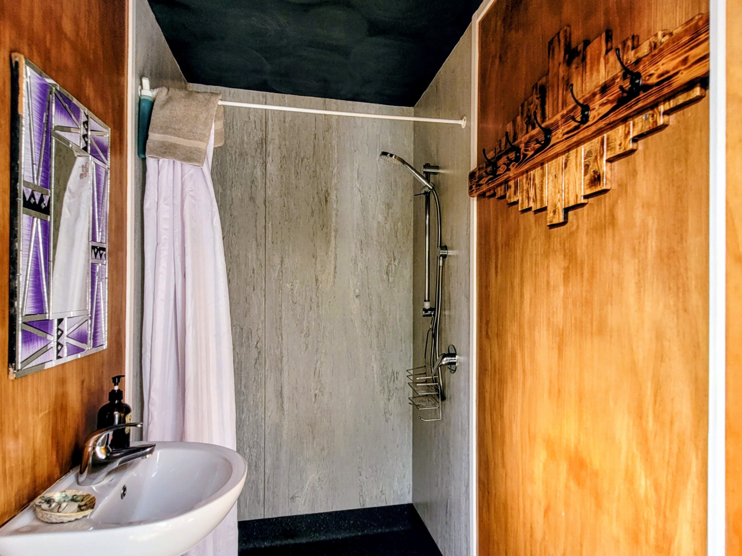 Guests enjoy easy access to modern hot showers, a fully equipped undercover outdoor kitchen, a BBQ, and lounge with unlimited WiFi. Fresh drinking water is available from the on-site hose, and we offer a bike shed for charging e-bikes.