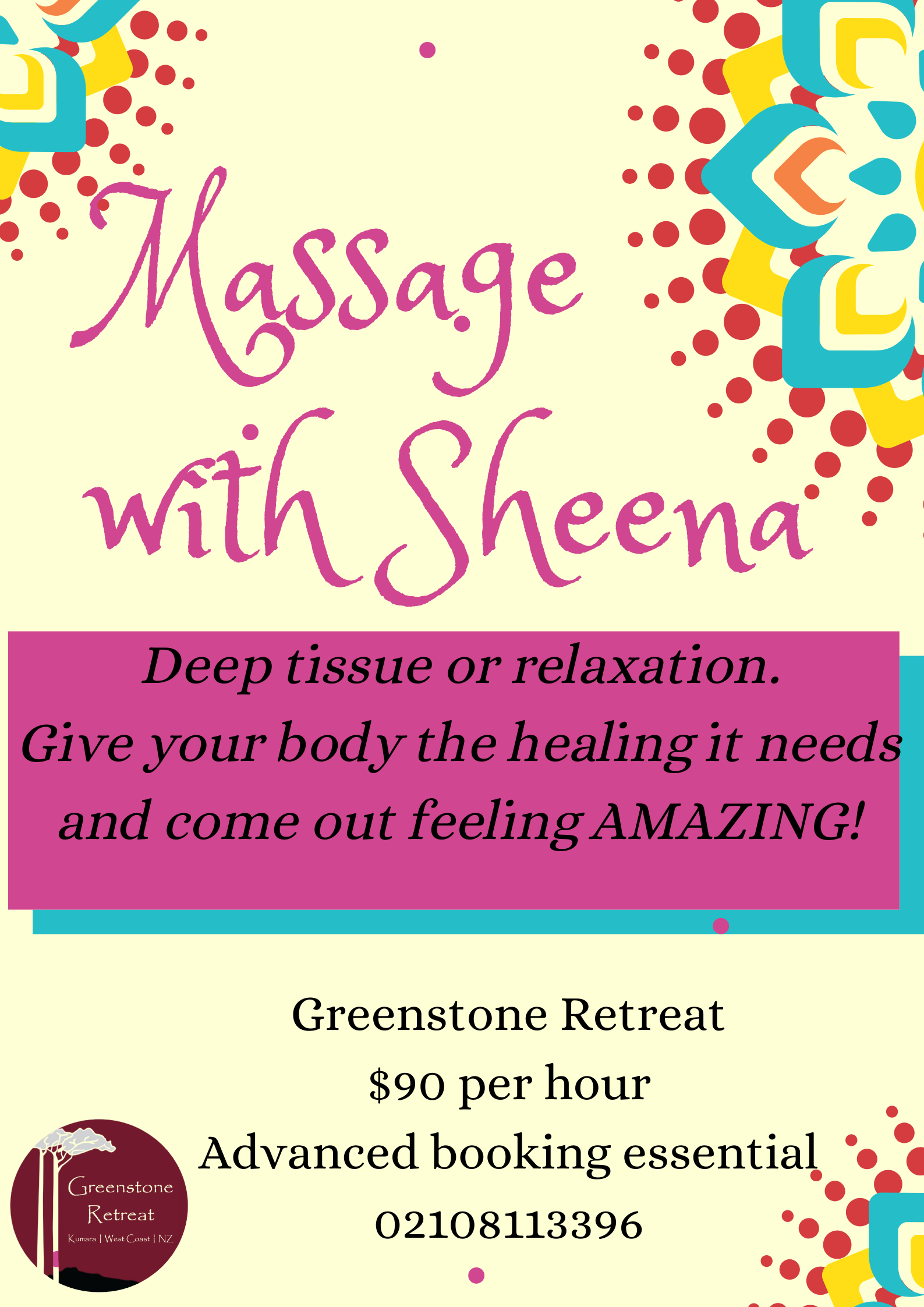 - Facebook — select “Mobile Massage” and add “Greenstone Retreat” in the comments